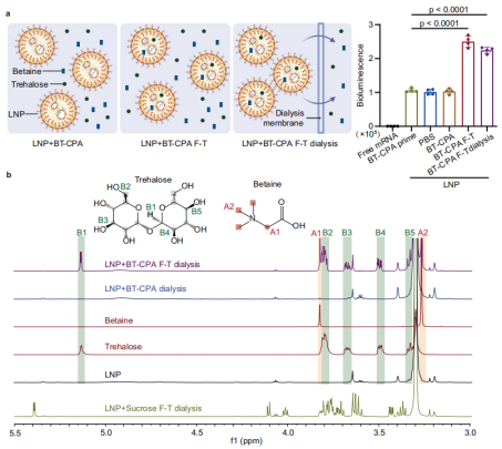 The researchers validated this mechanism using proton nuclear magnetic resonance (¹H NMR) and high-resolution mass spectrometry: In LNP+BT-CPA samples subjected to freeze-thaw cycles, characteristic signals of betaine (peaks at 3.28 ppm and 3.83 ppm) and trehalose (e.g., peak at 3.34 ppm) were detectable even after dialysis to remove external free BT-CPA. In contrast, LNP+BT-CPA samples not subjected to freeze-thaw cycles showed minimal BT-CPA encapsulation. This confirms that freezing is necessary for BT-CPA incorporation into LNPs, beyond simple surface adsorption.