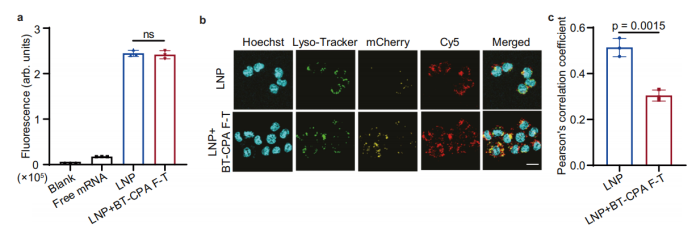 Unchanged Cellular Uptake, Enhanced Endosomal Escape: Flow cytometry showed that cellular uptake efficiency for SM-102-LNPs treated with BT-CPA and freeze-thaw (BT-CPA-LNPs) was nearly identical to fresh SM-102-LNPs. However, confocal microscopy revealed significantly reduced overlap between Cy5-labeled mRNA (red) and lysosomal markers (green) in BT-CPA-LNPs, with a significantly lower Pearson correlation coefficient (PCC) than fresh LNPs, indicating enhanced endosomal escape.