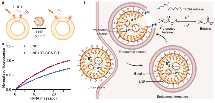 Molecular Mechanism: Betaine Protonation Mediates Membrane Fusion: Betaine, a zwitterionic molecule, undergoes protonation in the acidic endosomal environment, becoming positively charged and promoting electrostatic interactions with negatively charged endosomal membranes to facilitate fusion. Membrane fusion experiments using NBD-PE and Rhod-PE-labeled model endosomes showed stronger NBD fluorescence dequenching in BT-CPA-LNPs, confirming enhanced fusion capability.