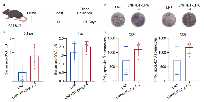 Stronger Immune Response: BT-CPA-LNPs encapsulating ovalbumin mRNA (mOVA) induced significantly higher OVA-specific IgG antibody titers at doses of 0.1 μg and 1 μg, and ELISpot assays showed increased IFN-γ-positive CD4⁺ and CD8⁺ T cells.