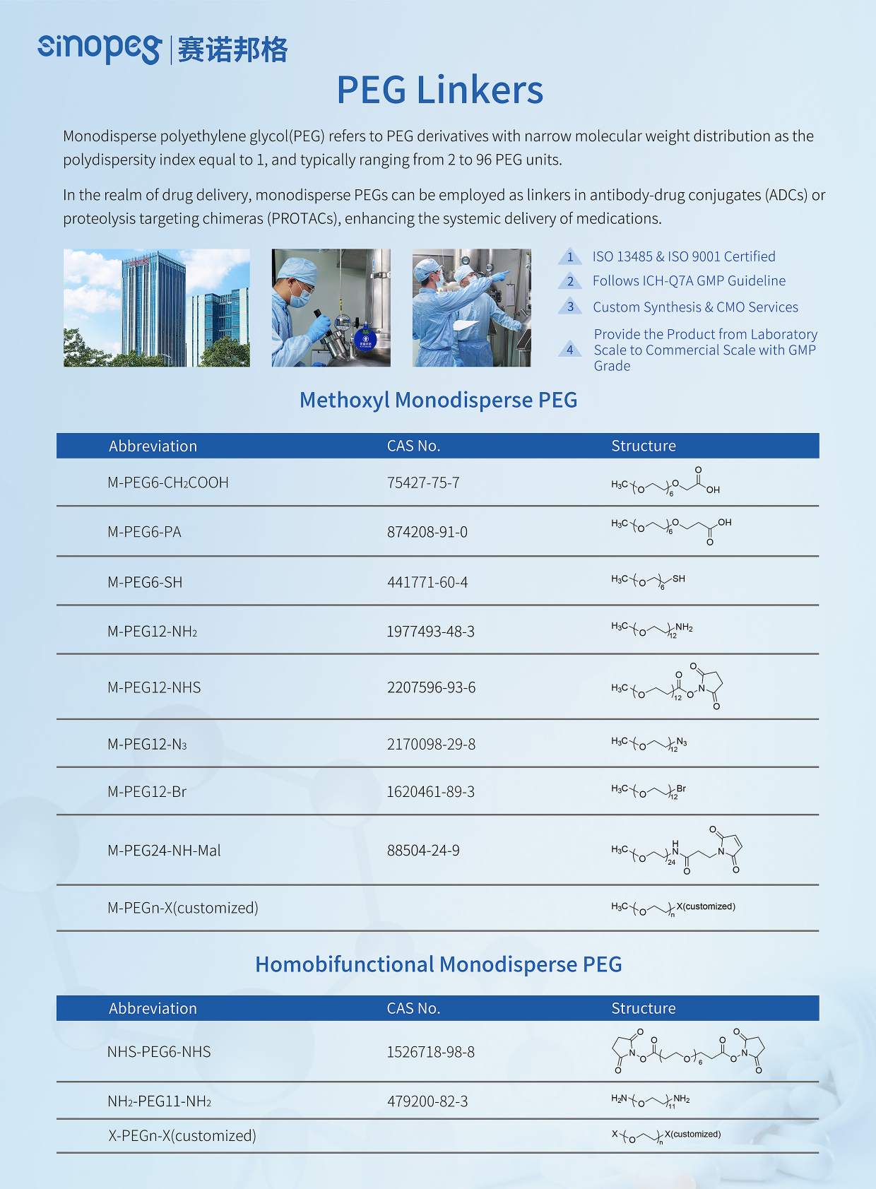 Acteur engagé dans le domaine des dérivés de PEG, Sinopeg s'appuie sur sa plateforme technologique avancée de synthèse et de purification pour fournir une série de dérivés de PEG monodisperses avec des structures bien définies, une pureté élevée et des extrémités fonctionnalisées, offrant un soutien solide à la R&D des médicaments RDC.
